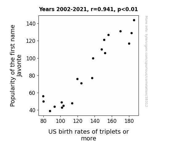 This means 88.6% of the change in the one variable (i.e., US birth rates of triplets or more) is predictable based on the change in the other (i.e., Popularity of the first name Javonte) over the 20 years from 2002 through 2021.