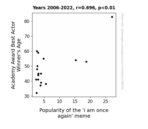 This means 48.5% of the change in the one variable (i.e., Popularity of the 'i am once again' meme) is predictable based on the change in the other (i.e., Academy Award Best Actor Winner's Age) over the 17 years from 2006 through 2022.