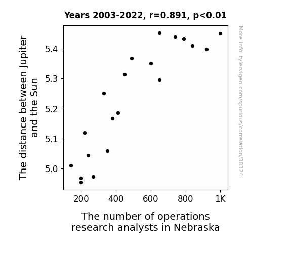 This means 79.4% of the change in the one variable (i.e., The number of operations research analysts in Nebraska) is predictable based on the change in the other (i.e., The distance between Jupiter and the Sun) over the 20 years from 2003 through 2022.