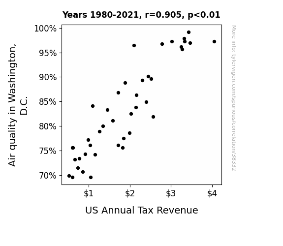 This means 81.9% of the change in the one variable (i.e., US Annual Tax Revenue) is predictable based on the change in the other (i.e., Air quality in Washington, D.C.) over the 42 years from 1980 through 2021.