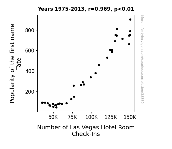 This means 93.8% of the change in the one variable (i.e., Number of Las Vegas Hotel Room Check-Ins) is predictable based on the change in the other (i.e., Popularity of the first name Tate) over the 39 years from 1975 through 2013.