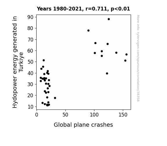 This means 50.6% of the change in the one variable (i.e., Global plane crashes) is predictable based on the change in the other (i.e., Hydopower energy generated in Turkiye) over the 42 years from 1980 through 2021.