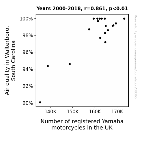 This means 74.2% of the change in the one variable (i.e., Number of registered Yamaha motorcycles in the UK) is predictable based on the change in the other (i.e., Air quality in Walterboro, South Carolina) over the 19 years from 2000 through 2018.
