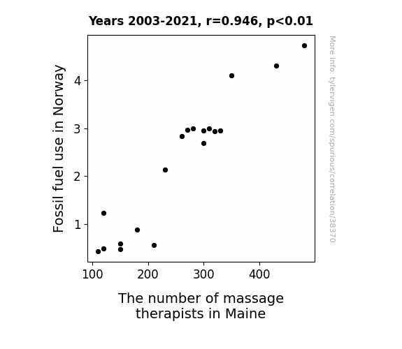 This means 89.6% of the change in the one variable (i.e., The number of massage therapists in Maine) is predictable based on the change in the other (i.e., Fossil fuel use in Norway) over the 19 years from 2003 through 2021.