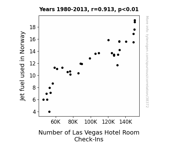 This means 83.4% of the change in the one variable (i.e., Number of Las Vegas Hotel Room Check-Ins) is predictable based on the change in the other (i.e., Jet fuel used in Norway) over the 34 years from 1980 through 2013.