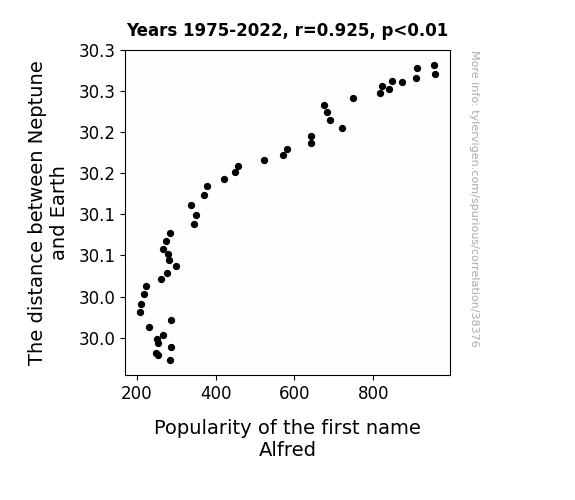 This means 85.6% of the change in the one variable (i.e., Popularity of the first name Alfred) is predictable based on the change in the other (i.e., The distance between Neptune and Earth) over the 48 years from 1975 through 2022.