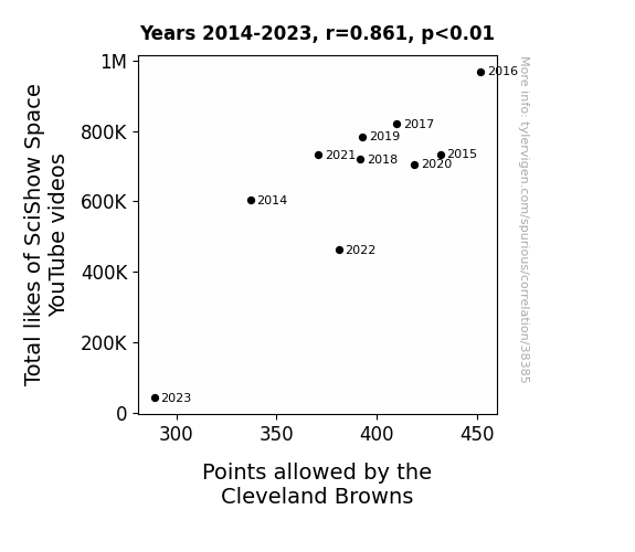 This means 74.1% of the change in the one variable (i.e., Points allowed by the Cleveland Browns) is predictable based on the change in the other (i.e., Total likes of SciShow Space YouTube videos) over the 10 years from 2014 through 2023.
