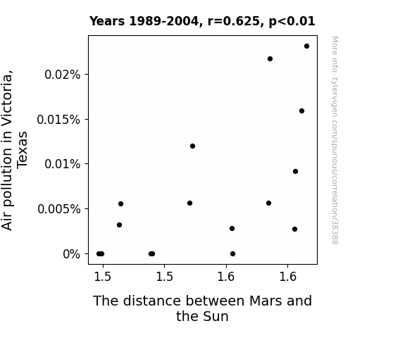 This means 39% of the change in the one variable (i.e., The distance between Mars and the Sun) is predictable based on the change in the other (i.e., Air pollution in Victoria, Texas) over the 16 years from 1989 through 2004.