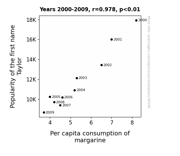 This means 95.6% of the change in the one variable (i.e., Per capita consumption of margarine) is predictable based on the change in the other (i.e., Popularity of the first name Taylor) over the 10 years from 2000 through 2009.