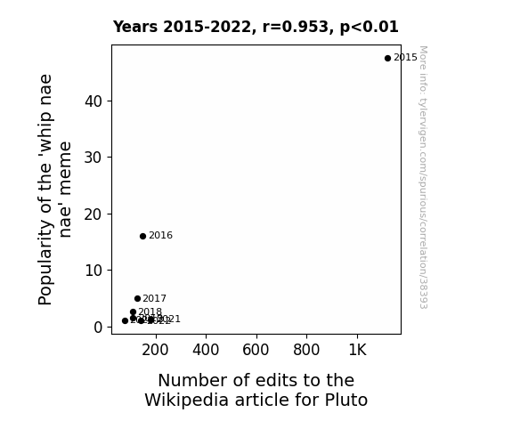 This means 90.8% of the change in the one variable (i.e., Number of edits to the Wikipedia article for Pluto) is predictable based on the change in the other (i.e., Popularity of the 'whip nae nae' meme) over the 8 years from 2015 through 2022.