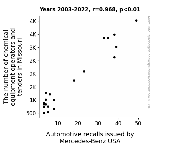 This means 93.8% of the change in the one variable (i.e., Automotive recalls issued by Mercedes-Benz USA) is predictable based on the change in the other (i.e., The number of chemical equipment operators and tenders in Missouri) over the 20 years from 2003 through 2022.