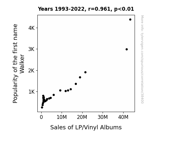 This means 92.4% of the change in the one variable (i.e., Sales of LP/Vinyl Albums) is predictable based on the change in the other (i.e., Popularity of the first name Walker) over the 30 years from 1993 through 2022.