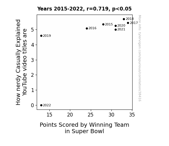 This means 51.6% of the change in the one variable (i.e., Points Scored by Winning Team in Super Bowl) is predictable based on the change in the other (i.e., How nerdy Casually Explained YouTube video titles are) over the 8 years from 2015 through 2022.