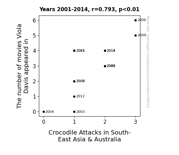 This means 62.8% of the change in the one variable (i.e., Crocodile Attacks in South-East Asia & Australia) is predictable based on the change in the other (i.e., The number of movies Viola Davis appeared in) over the 14 years from 2001 through 2014.