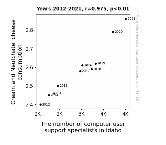 This means 95.1% of the change in the one variable (i.e., The number of computer user support specialists in Idaho) is predictable based on the change in the other (i.e., Cream and Neufchatel cheese consumption) over the 10 years from 2012 through 2021.