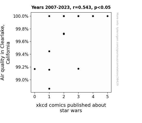 This means 29.5% of the change in the one variable (i.e., xkcd comics published about star wars) is predictable based on the change in the other (i.e., Air quality in Clearlake, California) over the 17 years from 2007 through 2023.
