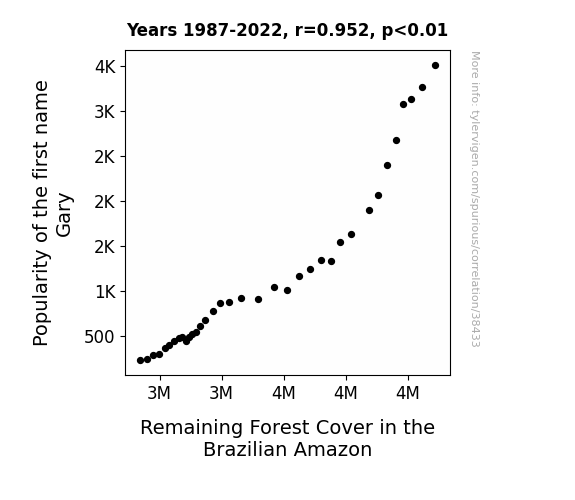 This means 90.5% of the change in the one variable (i.e., Remaining Forest Cover in the Brazilian Amazon) is predictable based on the change in the other (i.e., Popularity of the first name Gary) over the 36 years from 1987 through 2022.