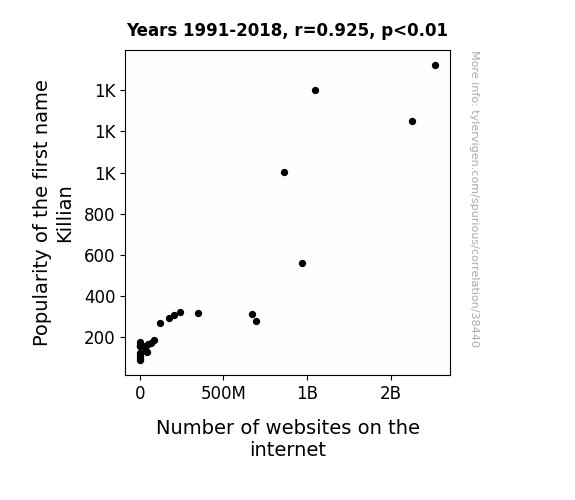 This means 85.5% of the change in the one variable (i.e., Number of websites on the internet) is predictable based on the change in the other (i.e., Popularity of the first name Killian) over the 28 years from 1991 through 2018.