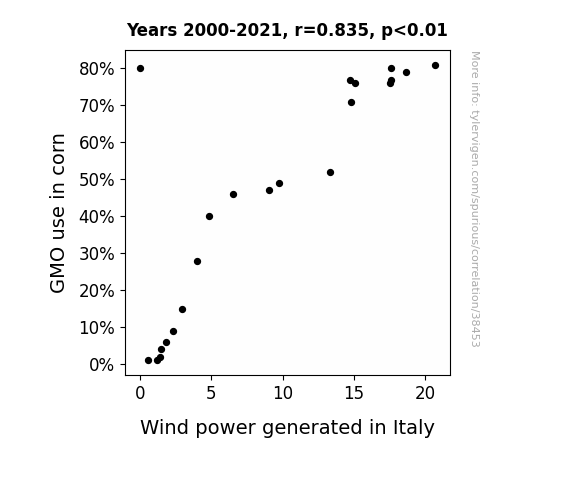 This means 69.8% of the change in the one variable (i.e., Wind power generated in Italy) is predictable based on the change in the other (i.e., GMO use in corn) over the 22 years from 2000 through 2021.