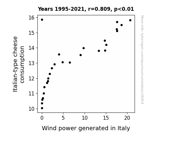 This means 65.5% of the change in the one variable (i.e., Wind power generated in Italy) is predictable based on the change in the other (i.e., Italian-type cheese consumption) over the 27 years from 1995 through 2021.