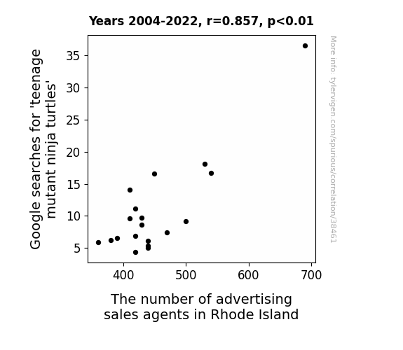 This means 73.4% of the change in the one variable (i.e., The number of advertising sales agents in Rhode Island) is predictable based on the change in the other (i.e., Google searches for 'teenage mutant ninja turtles') over the 19 years from 2004 through 2022.