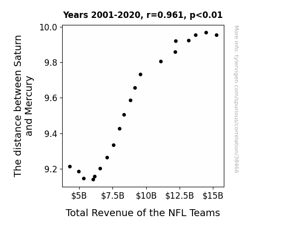 This means 92.3% of the change in the one variable (i.e., Total Revenue of the NFL Teams) is predictable based on the change in the other (i.e., The distance between Saturn and Mercury) over the 20 years from 2001 through 2020.