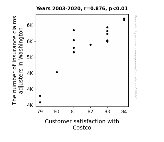 This means 76.7% of the change in the one variable (i.e., Customer satisfaction with Costco) is predictable based on the change in the other (i.e., The number of insurance claims adjusters in Washington) over the 18 years from 2003 through 2020.