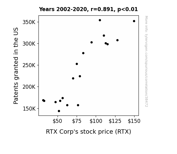 This means 79.3% of the change in the one variable (i.e., RTX Corp's stock price (RTX)) is predictable based on the change in the other (i.e., Patents granted in the US) over the 19 years from 2002 through 2020.