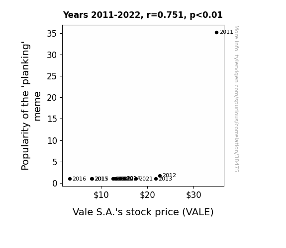 This means 56.4% of the change in the one variable (i.e., Vale S.A.'s stock price (VALE)) is predictable based on the change in the other (i.e., Popularity of the 'planking' meme) over the 12 years from 2011 through 2022.