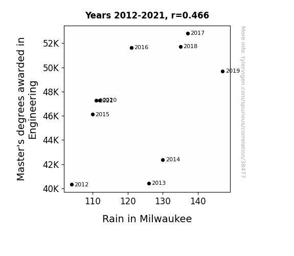 This means 21.7% of the change in the one variable (i.e., Rain in Milwaukee) is predictable based on the change in the other (i.e., Master's degrees awarded in Engineering) over the 10 years from 2012 through 2021.