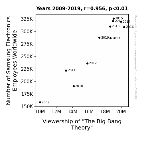 This means 91.4% of the change in the one variable (i.e., Viewership of "The Big Bang Theory") is predictable based on the change in the other (i.e., Number of Samsung Electronics Employees Worldwide) over the 11 years from 2009 through 2019.