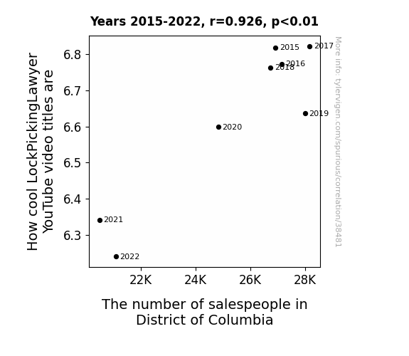 This means 85.7% of the change in the one variable (i.e., The number of salespeople in District of Columbia) is predictable based on the change in the other (i.e., How cool LockPickingLawyer YouTube video titles are) over the 8 years from 2015 through 2022.