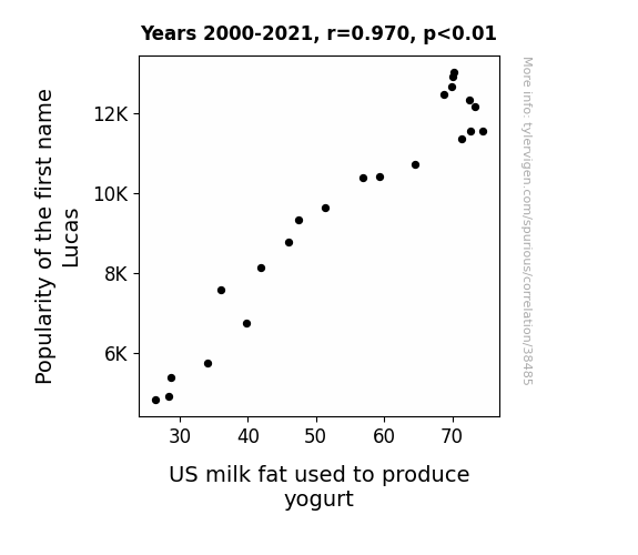 This means 94.1% of the change in the one variable (i.e., US milk fat used to produce yogurt) is predictable based on the change in the other (i.e., Popularity of the first name Lucas) over the 22 years from 2000 through 2021.