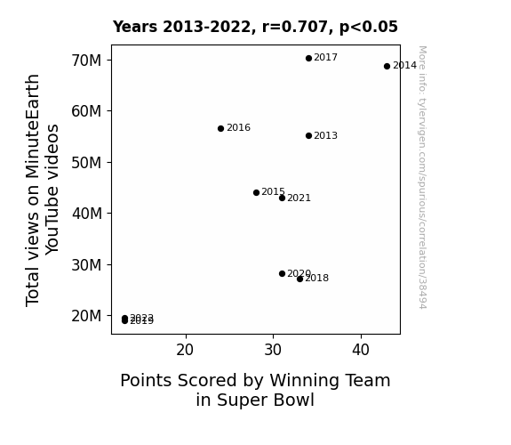 This means 49.9% of the change in the one variable (i.e., Points Scored by Winning Team in Super Bowl) is predictable based on the change in the other (i.e., Total views on MinuteEarth YouTube videos) over the 10 years from 2013 through 2022.