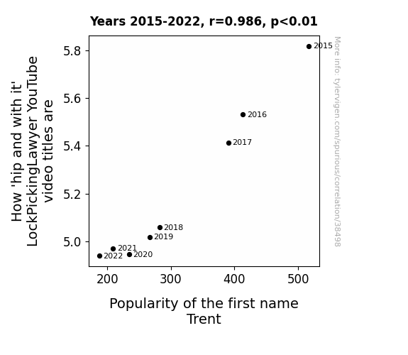 This means 97.1% of the change in the one variable (i.e., Popularity of the first name Trent) is predictable based on the change in the other (i.e., How 'hip and with it' LockPickingLawyer YouTube video titles are) over the 8 years from 2015 through 2022.
