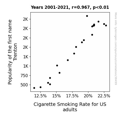 This means 93.5% of the change in the one variable (i.e., Cigarette Smoking Rate for US adults) is predictable based on the change in the other (i.e., Popularity of the first name Trenton) over the 21 years from 2001 through 2021.