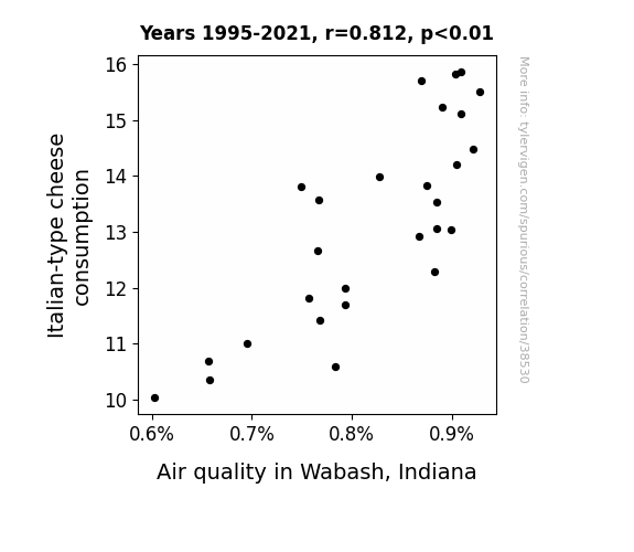 This means 65.9% of the change in the one variable (i.e., Air quality in Wabash, Indiana) is predictable based on the change in the other (i.e., Italian-type cheese consumption) over the 27 years from 1995 through 2021.