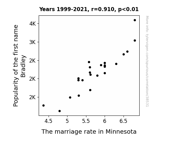 This means 82.9% of the change in the one variable (i.e., The marriage rate in Minnesota) is predictable based on the change in the other (i.e., Popularity of the first name Bradley) over the 23 years from 1999 through 2021.