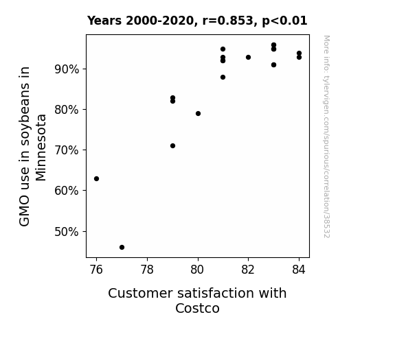This means 72.8% of the change in the one variable (i.e., Customer satisfaction with Costco) is predictable based on the change in the other (i.e., GMO use in soybeans in Minnesota) over the 21 years from 2000 through 2020.