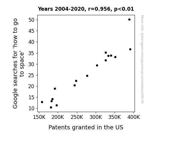 This means 91.4% of the change in the one variable (i.e., Patents granted in the US) is predictable based on the change in the other (i.e., Google searches for 'how to go to space') over the 17 years from 2004 through 2020.