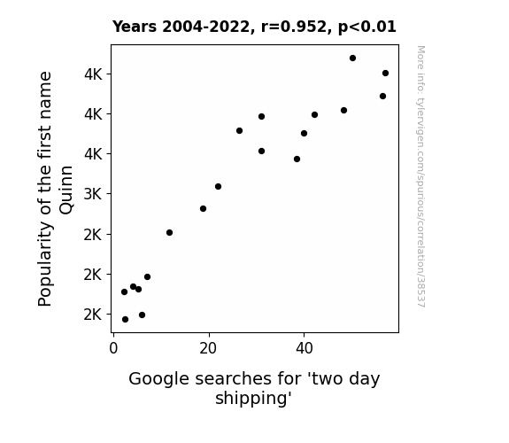 This means 90.6% of the change in the one variable (i.e., Google searches for 'two day shipping') is predictable based on the change in the other (i.e., Popularity of the first name Quinn) over the 19 years from 2004 through 2022.
