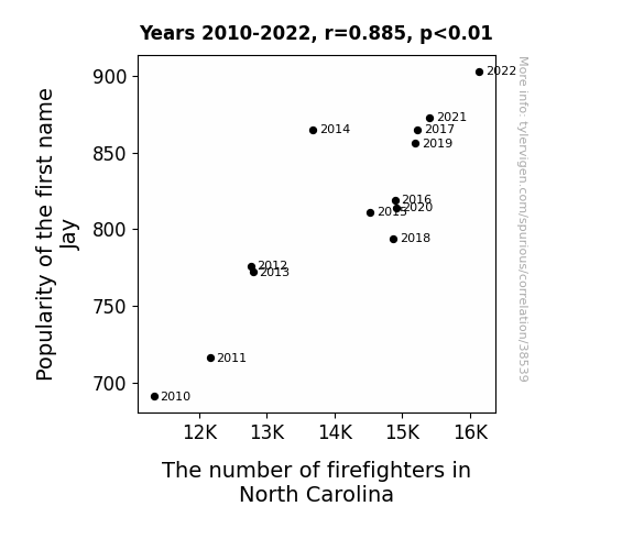 This means 78.4% of the change in the one variable (i.e., The number of firefighters in North Carolina) is predictable based on the change in the other (i.e., Popularity of the first name Jay) over the 13 years from 2010 through 2022.