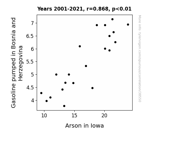 This means 75.3% of the change in the one variable (i.e., Arson in Iowa) is predictable based on the change in the other (i.e., Gasoline pumped in Bosnia and Herzegovina) over the 21 years from 2001 through 2021.