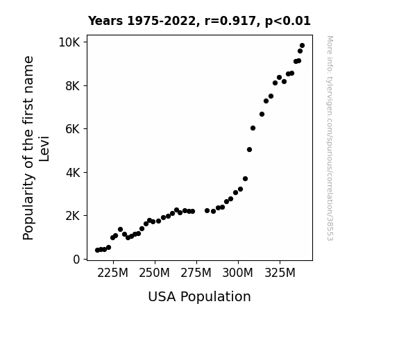 This means 84% of the change in the one variable (i.e., USA Population) is predictable based on the change in the other (i.e., Popularity of the first name Levi) over the 48 years from 1975 through 2022.