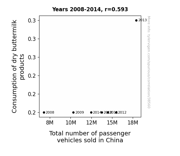 This means 35.2% of the change in the one variable (i.e., Total number of passenger vehicles sold in China) is predictable based on the change in the other (i.e., Consumption of dry buttermilk products) over the 7 years from 2008 through 2014.