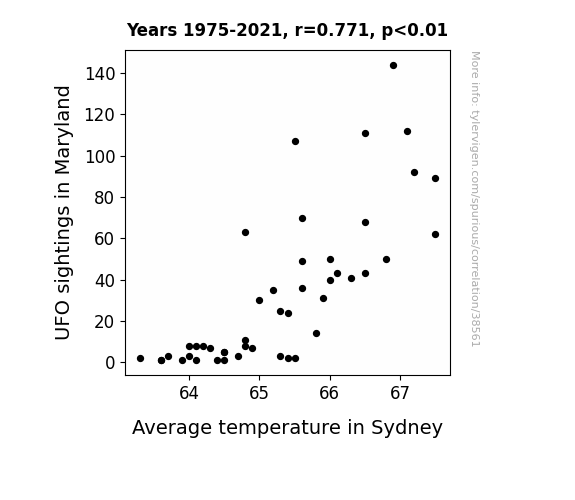 This means 59.4% of the change in the one variable (i.e., Average temperature in Sydney) is predictable based on the change in the other (i.e., UFO sightings in Maryland) over the 46 years from 1975 through 2021.