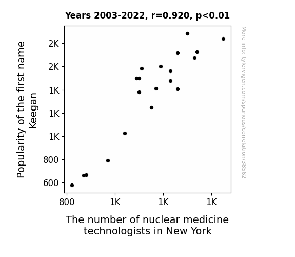 This means 84.7% of the change in the one variable (i.e., The number of nuclear medicine technologists in New York) is predictable based on the change in the other (i.e., Popularity of the first name Keegan) over the 20 years from 2003 through 2022.