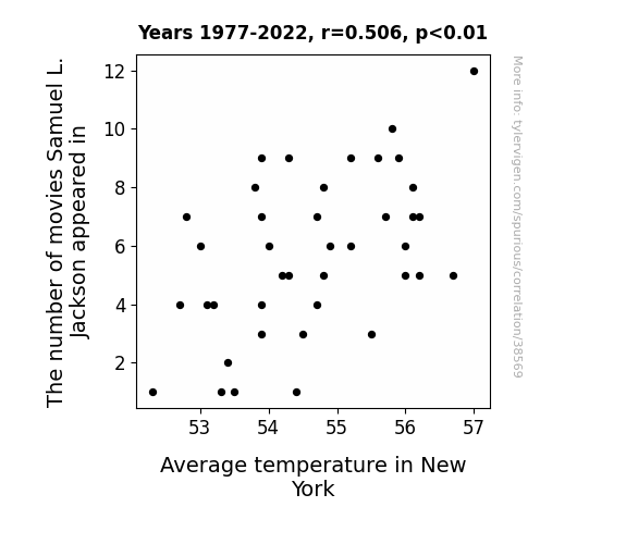 This means 25.6% of the change in the one variable (i.e., Average temperature in New York) is predictable based on the change in the other (i.e., The number of movies Samuel L. Jackson appeared in) over the 40 years from 1977 through 2022.