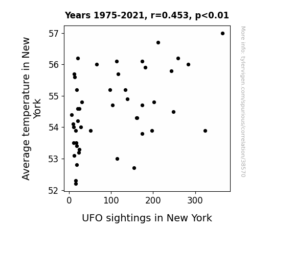 This means 20.5% of the change in the one variable (i.e., UFO sightings in New York) is predictable based on the change in the other (i.e., Average temperature in New York) over the 47 years from 1975 through 2021.