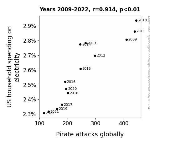 This means 83.5% of the change in the one variable (i.e., Pirate attacks globally) is predictable based on the change in the other (i.e., US household spending on electricity) over the 14 years from 2009 through 2022.